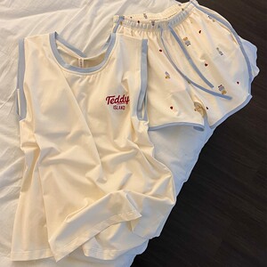 優しい癒し風テディベアパジャマ胸パッド付き女性用夏快適ノースリーブベストショーツホームウェア2点セット