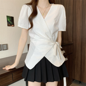 フレンチパフスリーブVネック右肩イエロー半袖シャツ女性用2025夏大きいサイズファットmmストラップウエストトップ
