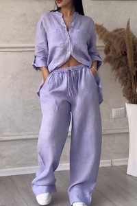 2024 ヨーロッパとアメリカのクロスボーダー_独立したステーション Amazon カジュアルコットンとリネンの無地シャツ巾着ワイドレッグパンツスーツ