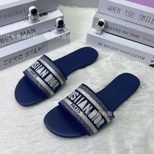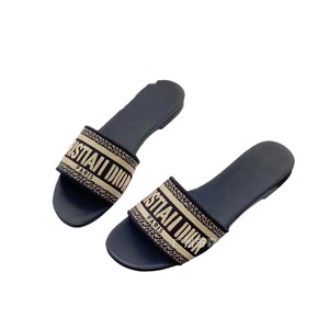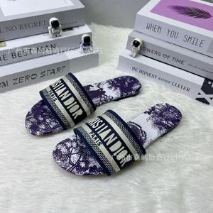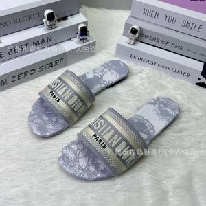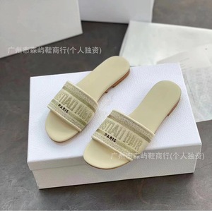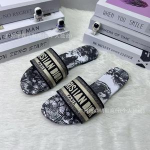 女性が外で履くためのDファミリースリッパのハイバージョン2024新しいフラットソールスリッパ、多用途の刺繍文字シルク付き