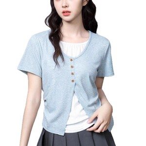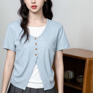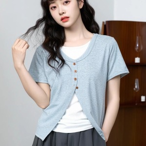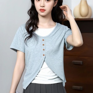 抖音一件代发夏季92%棉假两件小个子短袖T恤女式修身气质短款上衣