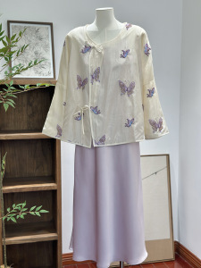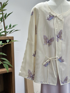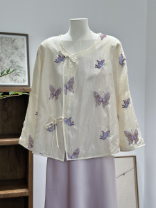 新しい中国風の春夏ハイエンド紫蝶ビーズ刺繍斜め襟レースアップ禅シャツシャツトップジャケット新しい