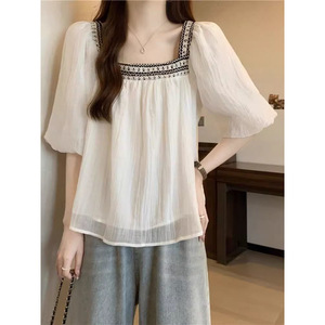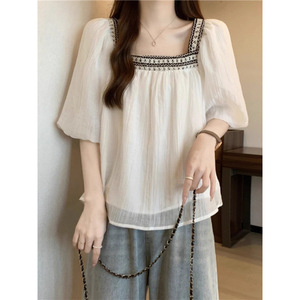 ファットMM夏の優しいスタイルのスクエアカラードールシャツはお腹をカバーし、スリムに見えるトップス、女性用の大きいサイズのフレンチパフスリーブシフォンシャツ