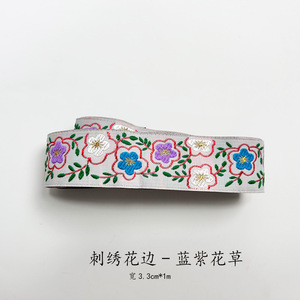 3.3CM 刺繍レース-青と紫の花と草 1m