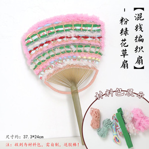 ミックス糸編み ピンクとグリーンの花と草の扇子(扇骨含む)