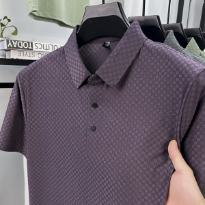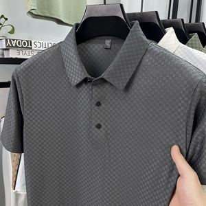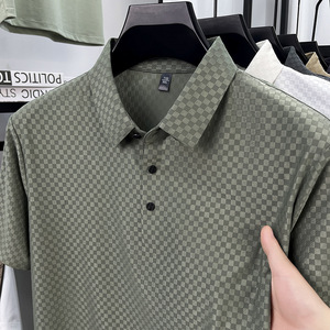 出口韩版男士短袖T恤无痕弹力冰丝夏季翻领T恤男格子提花T恤上衣