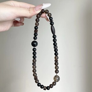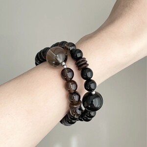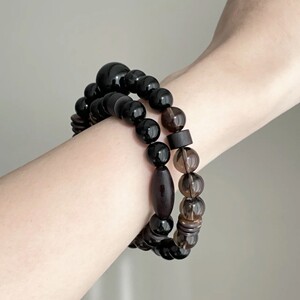XINGSHI | 天然新中国風ダブルサークルティークリスタル黒曜石サンダルウッドココナッツシェルセパレーター禅ブレスレットナチュラル