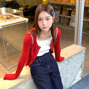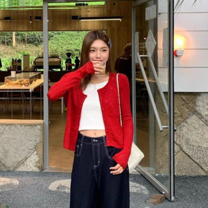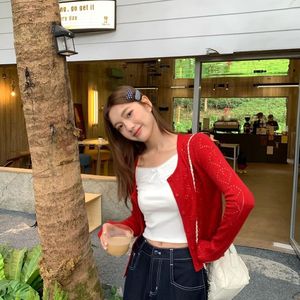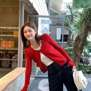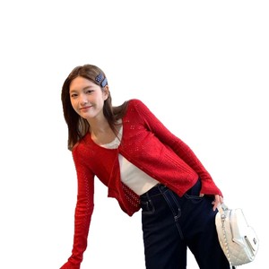 レッド香港スタイルレトロ中空薄型日焼け止めアウターニットカーディガンジャケット女性の夏の怠惰なスタイルのショートトップ