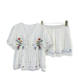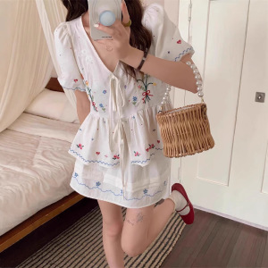 韓国のニッチ! 2025 夏の新スタイルヘビー刺繍デザイン V ネックシャツ女性 + A ラインカジュアルスカートイン