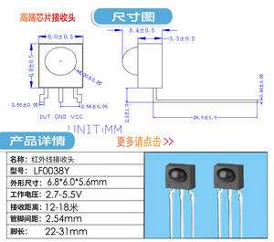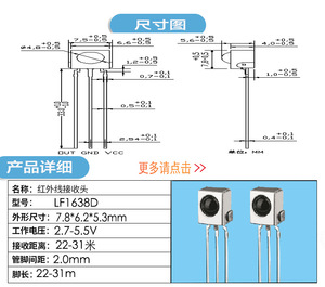 赤外線受信ヘッド、小型、低消費電力、小型間隔リモコン受信ヘッド、フットピッチ1.27mm狭足受信ヘッド