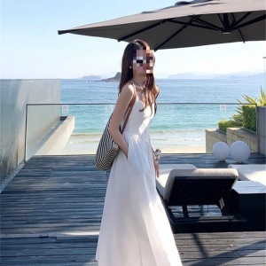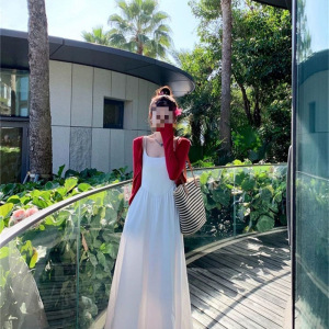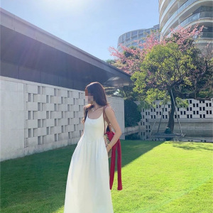 2025年新作夏の雰囲気韓国風優しいサスペンダードレス甘くスリムな気質ウエストホワイトロングスカート