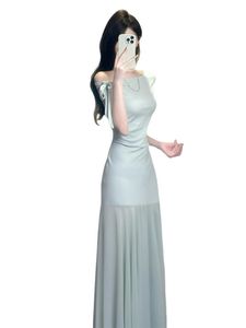 法式绿色露肩网纱连衣裙子女装夏季2025新款气质绝美收腰包臀长裙