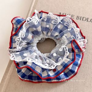 ネイビーブルーのチェック柄、赤いエッジ、白いレースのヘアゴム、多用途で新鮮な気質の女の子のヘアゴム、ヘアアクセサリー