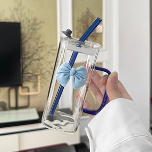 透明なシンプルな正方形のウォーターカップインスタイルのリボンハンドル付きガラスストローカップ高温耐性コーヒーミルクカップ