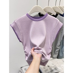 韓国風コントラストカラーアイスシルク薄手Tシャツレディースおしゃれ年齢軽減ストライプ半袖2025夏ファッション小飛袖トップス