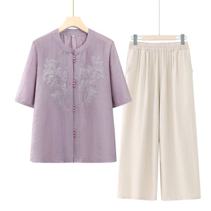 新しい中国風の夏半袖ママスーツツーピースセット外国風トップス中高年女性の夏のTシャツ