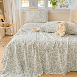 インス風花柄二層ガーゼベッドシーツ3点セットシングルピースウォッシュコットンシーツ寝室ダブル学生寮シーツ