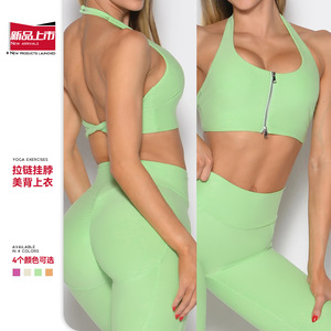 ヨーロッパとアメリカのクロスボーダーデザイン、ダブルジッパー付きヨガスポーツブラ、女性用、ホルターネック、背中開き、ツイストデザイン、アウトドアフィットネス、ランニングブラ、美背