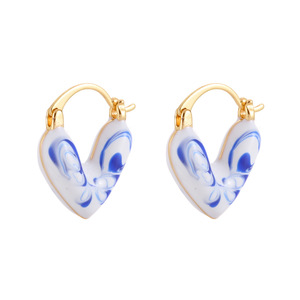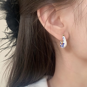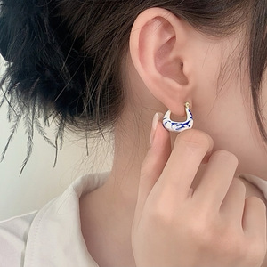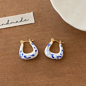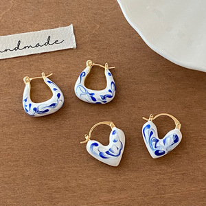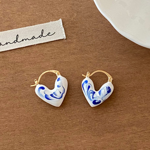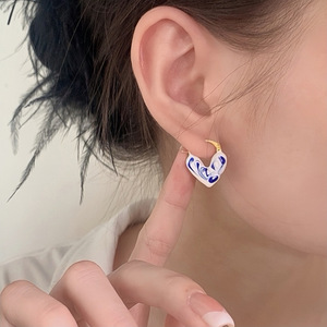 中国のレトロなハイエンドの青と白の磁器オイルドリップイヤリングニッチファッション多用途デザインシンプルなラブイヤリング女性用