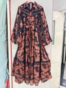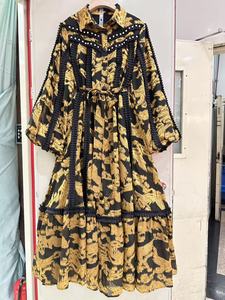 2025 春夏新作ラペルランタンスリーブレトロプリント耳付きダイヤモンドルーズドレスベルト付き