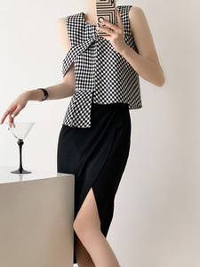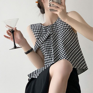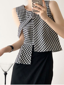 フレンチスタイルの女性用サマーキャミソール、新しいノースリーブの黒と白のチェック柄の不規則なデザインのニッチトップ