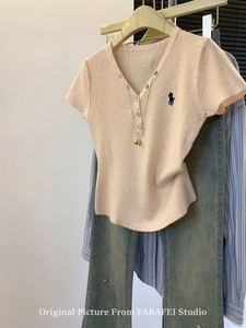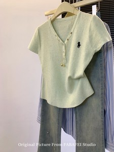 zdm プラスサイズ 150kg 個別におすすめ〜ポニー刺繍半袖 Tシャツレディース夏ボタン V ネックニットトップスイン