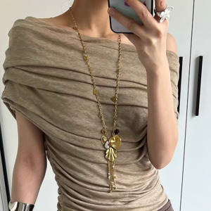 古代文学風! ゴールデンシェルタッセルロングネックレスレディースフレンチレトロリゾートスタイル鎖骨チェーンセーターチェーン