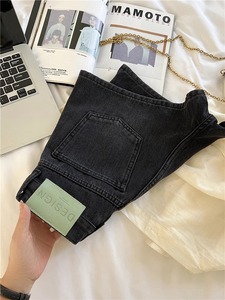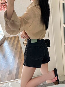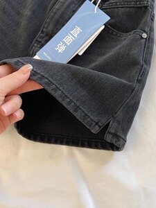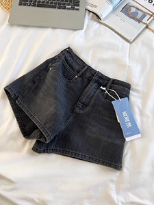 店のエース!!女性用のスタイリッシュなブラックとグレーのスリット付きハイウエストAラインデニムショートパンツ、ゆったりとしたスリムなカジュアルホットパンツ