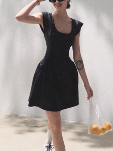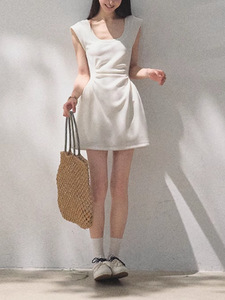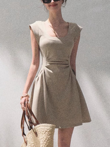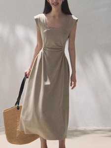 Basic*小島の夏 リヨセルUネック肌に優しいデイリー直角肩ウエストドレス