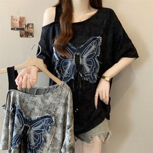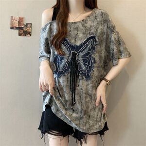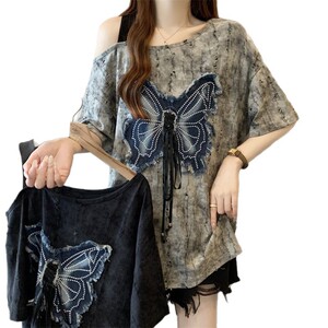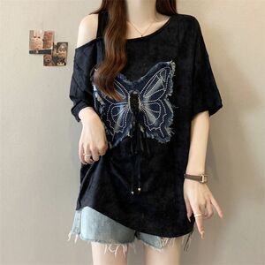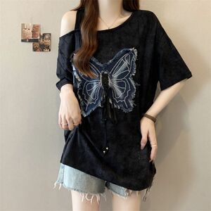 大きいサイズのレトロな穴あき蝶装飾半袖 Tシャツ女性のための夏 2025 新しいルーズ痩身ファッショントップス女性のための