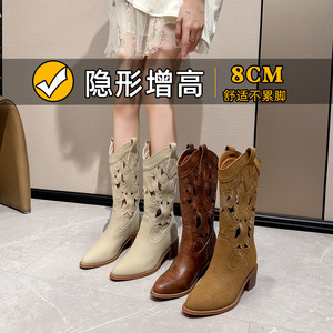 ディリレアと同じスタイルの女性用ウエスタンカウボーイブーツ、夏用ブラウンマーティンブーツ、ソフトレザー中空刺繍ポインテッドトゥナイトブーツ