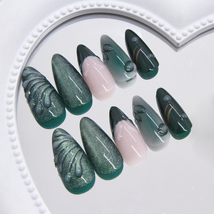 外国貿易立体グリーン波形フレンチキャットアイクール感取り外し可能ウェアラブルネイル24ピースプレスオンネイル