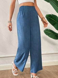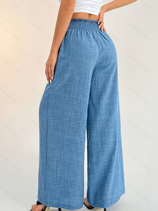 2025 ファッション カジュアル レディース エレガント ブルー ワイドレッグ パンツ - ハイウエスト、ルーズ フィット、ストレート、ポリエステル