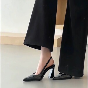 フレンチスタイルのつま先が空いたバックストラップサンダル、女性用夏の新しいスタイルのパテントレザーポインテッドトゥファッション厚いハイヒールシングルシューズ
