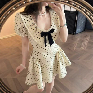 フレンチスタイルのリボン半袖水玉ドレス女性のための夏の新しいウエスト痩身シックで美しいスカート
