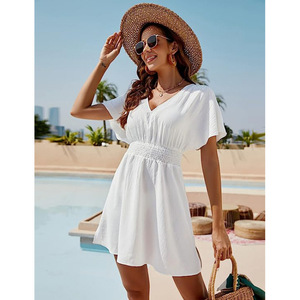 ヨーロッパとアメリカのクロスボーダー婦人服 2023 アマゾン夏の新しいビーチ日焼け止めスカートカジュアル V ネックプリーツドレス女性のための