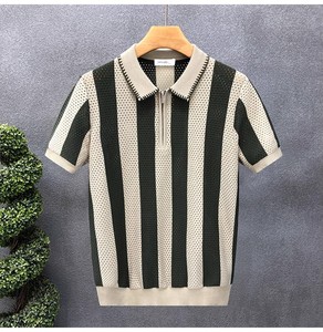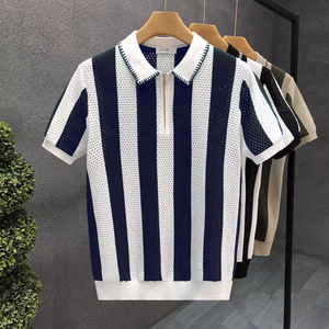 外国貿易卸売 2025 新しいハーフジップラペルメンズポロシャツレトロ中空ニットストライプボトムストップ