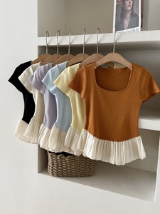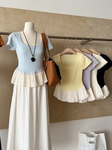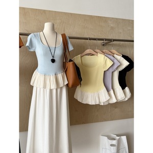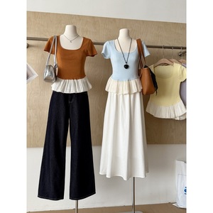フレンチコントラストカラーステッチスクエアカラー半袖Tシャツレディース夏裾フリルスカートトップウエスト痩身