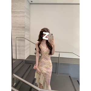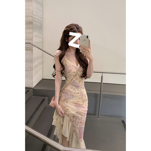 夏の新しいハイエンドフレンチミッドセンチュリー花柄レースドレスフリルウエスト気質スリム不規則なスカート