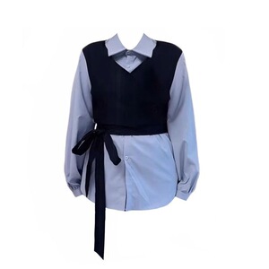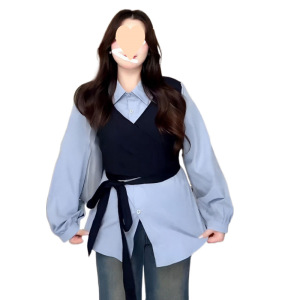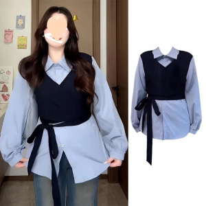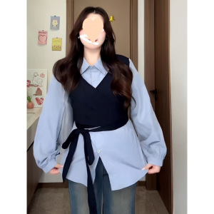大码女装胖慵懒风假两件绑带马甲衬衫2025春季新款时尚显瘦上衣