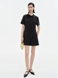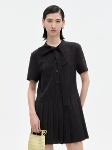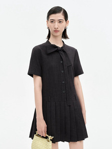 仿麻感深灰色飘带领连衣裙子女夏季新款优雅拼接百褶A字裙 2025年
