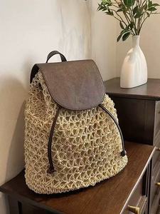 ファッショナブルな中空カバーショルダーわらバッグ新しい韓国スタイルのスプライシングレースアップ織バッグ女性の海辺の休暇ビーチバッグ