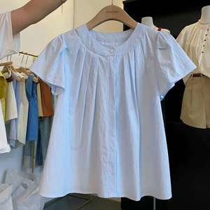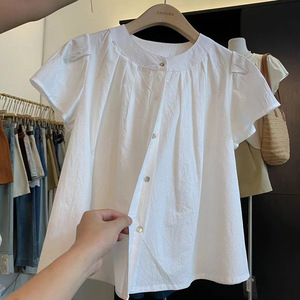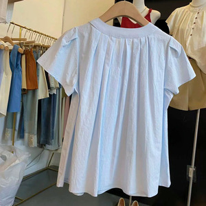 夏の新しいスタイルの女性用小柄な半袖プリーツフライングスリーブトップス、女性用スリムで多用途な高級シャツ