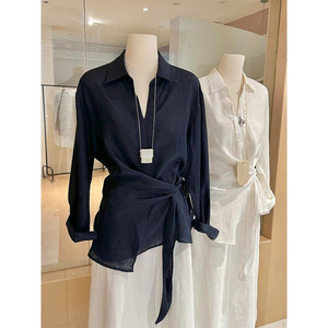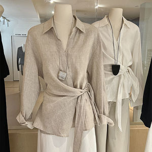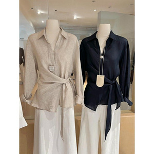 気質怠惰なスタイルのリネン通気性シャツトップ女性の夏の新しいデザインレースアップ長袖シャツトレンディ