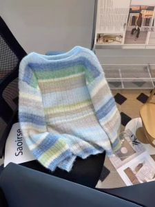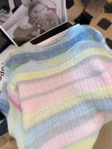 工厂直销彩虹条温柔风马海毛慵懒宽松软糯针织衫毛衣上衣春季新款
