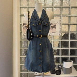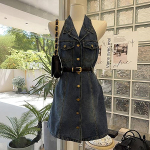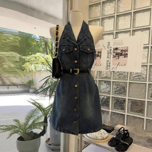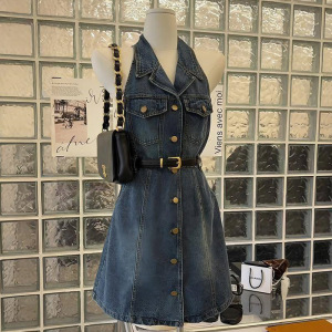 香港スタイルのレトロラペルデニムドレス女性のための 2025 春と夏の新しいスタイルの小さなウエスト痩身ノースリーブショートスカート