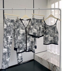 中国風水墨画パジャマ4点セット薄手レディースアイスシルクファッションプリントホームウェアセットサスペンダーカーディガン