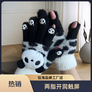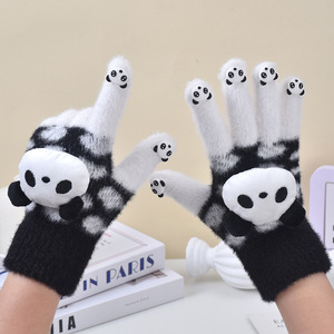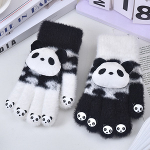 女性用手袋、冬用指なしタッチスクリーン、厚くて暖かい、男女学生が書くための防寒、ぬいぐるみパンダ、かわいい不凍液