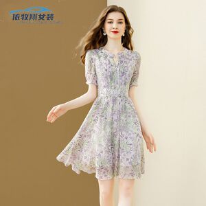 シフォンドレスショートレディース夏新作Vネック膝気質年齢軽減ウエストドレス小柄な方向け