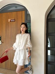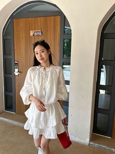 【一目で千年】ホワイトムーンライトシリーズ 薄手コットン刺繍フレンチランタンスリーブシャツ+フリルスカートセット